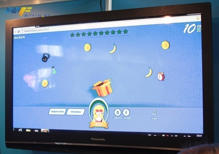Первый – возможность сыграть в компьютерную игру и выиграть приятные подарки. Суть игры довольно простая: на экране падают различные предметы – сейфы, бананы, деньги… В виртуальную коробку игрок должен складывать полезные вещи вроде банковских карт и наличных денег, и при этом ловко уворачиваться от сыплющихся сверху бананов и гирь.