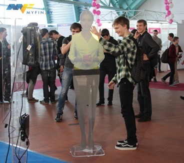 Возле стенда Национального банка Беларуси стоит симпатичная молодая девушка и о чем-то увлеченно рассказывает. Подходя поближе, понимаешь: девушка не настоящая. Она, похоже, вырезана из стекла или какого-то прозрачного пластика. Но при этом ведет себя как живая – например, сопровождает свой рассказ жестикуляцией, а мимика лица на 100% соответствует тому, что она говорит.