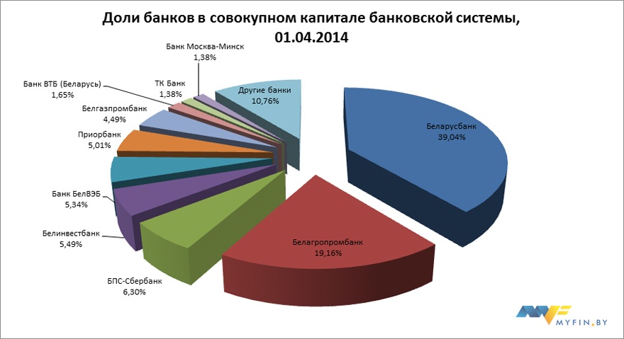 На долю Беларусбанка приходится 39,04% совокупного капитала банковской системы, Белагропромбанка – 19,16%, БПС-Сбербанка – 6,3%, Белинвестбанка – 5,49%, Банка БелВЭБ – 5,34%, Приорбанка – 5,01%, Белгазпромбанка – 4,49%. На восьмом месте оказался Банк ВТБ (Беларусь), капитал которого составляет 1,65% от совокупного капитала банковской системы, на девятом – ТК Банк (1,38%), на десятом – Банк Москва-Минск (1,38%).