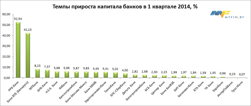 На рисунке ниже наглядно представлена информация о темпах прироста капитала белорусских банков в 1 квартале 2014 года.