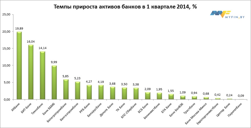 По темпам прироста активов в 1 квартале 2014 года лидирует ХКБанк (на 19,89%), который в результате улучшил свои позиции в рейтинге, поднявшись с 15 на 13 место.