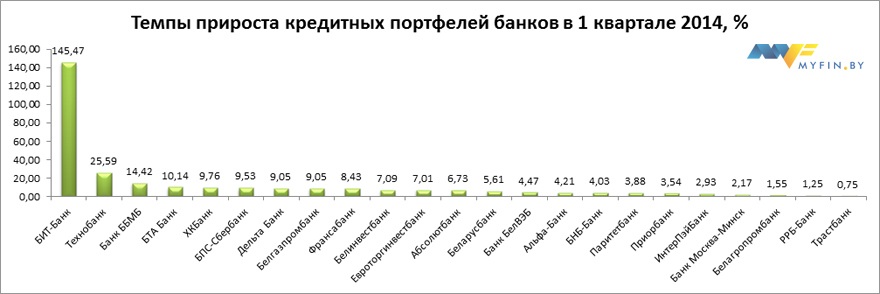 Наибольшие темпы прироста кредитного портфеля в 1 квартале 2014 года продемонстрировал БИТ-Банк – 145,47%. На втором месте – Технобанк, объем выданных кредитов которого вырос на 25,59%, на третьем – Банк ББМБ (14,42%).