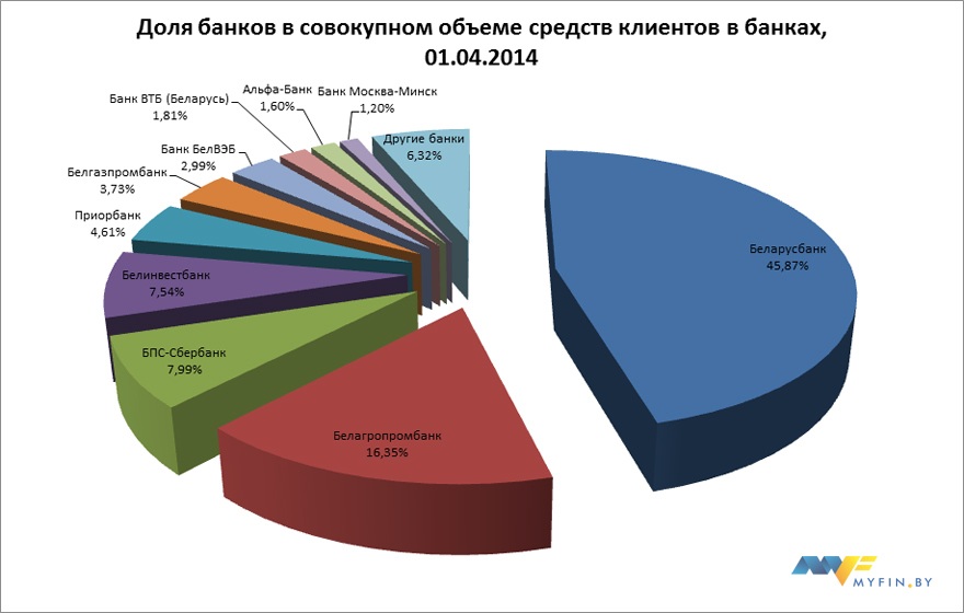 Объем средств клиентов, хранящихся на счетах в банках Беларуси, по состоянию на 1 апреля 2014 года составил 232 547 420,9 млн рублей. Прирост по сравнению с показателем на 1 января 2014 года достиг 4,75%.