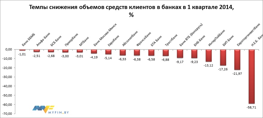 На рисунке ниже наглядно представлена информация темпах снижения объема средств клиентов на счетах в белорусских банках в 1 квартале 2014 года.