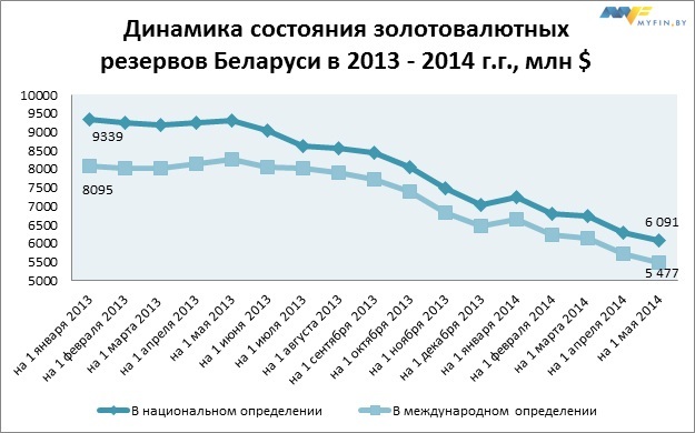 Золотовалютные резервы Беларуси по итогам апреля сократились еще на 238,1 млн долларов США в международном определении. По предварительным данным, на 1 мая текущего года «золотой запас» нашего государства составил 5 477,0 млн долларов США в эквиваленте.