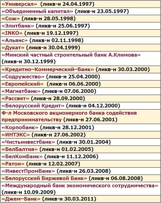 Согласно официальной отчетности Национального банка, за всю суверенную историю Беларуси было ликвидировано 25 банков.