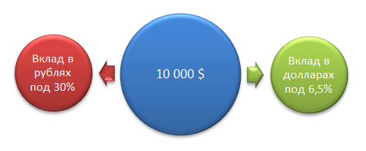 Проценты от размещения 10 000$ на валютный вклад под 6,5% годовых составят 54$, а общая сумма сбережений - 10 054$. Разделив итоговую рублёвую сумму на валютную, получаем критический курс доллара, равный 14 385 рублей за доллар. При таком курсе продажи доллара доходность валютного вклада будет равна доходности рублёвого.
