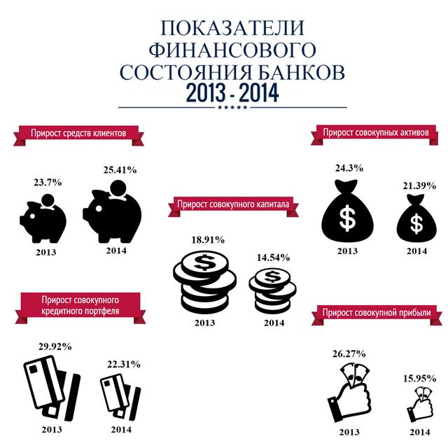В 2014 году наблюдался прирост рассмотренных показателей финансового состояния банков. Однако стоит отметить, что темпы прироста основных показателей банков сократились по сравнению с 2013 годом. Быстрее росли только средства клиентов, однако сокращение кредитования не позволило банкам ускорить темпы прироста прибыли. Судите сами: