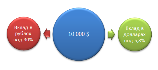 Сумма полученных процентов при размещении вклада суммой 10 000$ в долларах под 5,8% годовых составит 48,3$ или 10 048,3$ общей суммы. Курс, при котором доходность рубля и доллара станет равной рассчитаем разделив сумму на рублёвом вкладе через 1 месяц на сумму вклада инвалютного. На следующий месяц он будет равным 15 607 рублям.