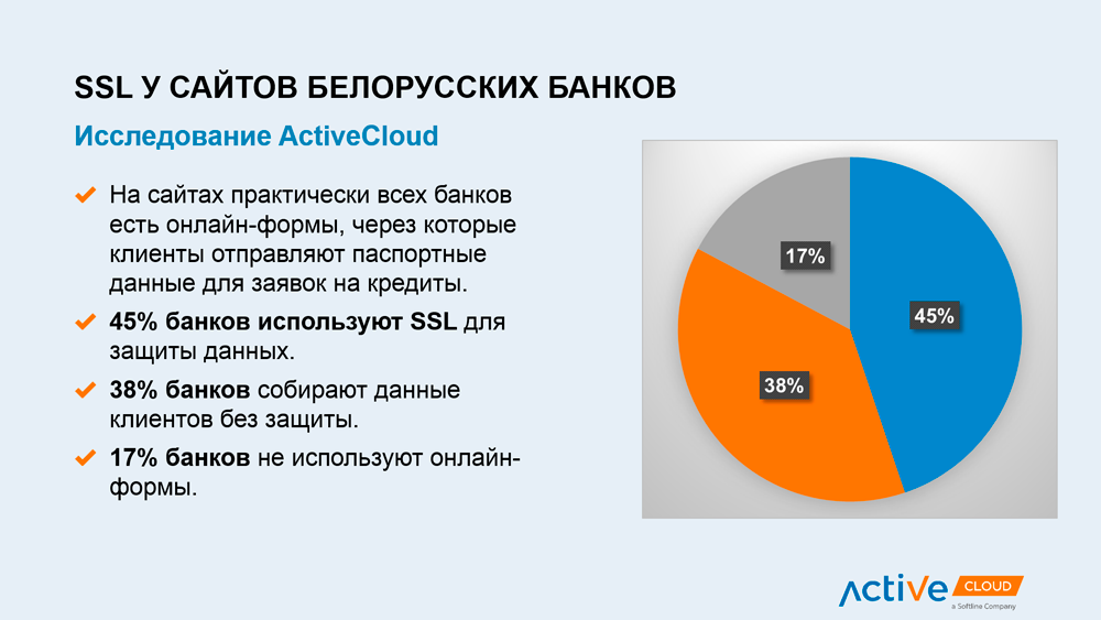 Компания ActiveCloud, занимающая в Беларуси лидирующие позиции на рынке облачных решений и виртуального хостинга, сравнила сайты 27 белорусских банков и определила из них наиболее защищенные для интернет-пользователей.