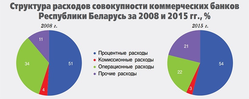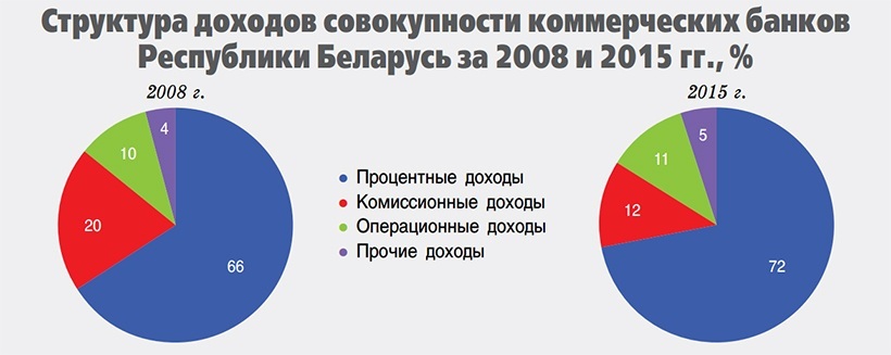За 7 лет в структуре доходов белорусских комбанков доля процентных выросла, а комиссионных снизилась. С 2008-го по 2015-й первые увеличились на 6 процентных пунктов, а вторые уменьшились на 8.