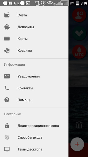 Раздел с подсказками и контактами найдётся, если нажать на три полоски в нижней левой части экрана. Тут же откроется выпадающее меню, через которое можно также посмотреть информацию о своих счетах, карточках, депозитах и кредитах в Альфа-Банке, а также произвести ряд настроек. Например, персонализировать рабочий стол. Выбор тем для десктопа достаточно обширен, но добавлять свои обои туда нельзя. Во всяком случае, пока что.