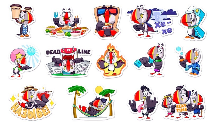 На стикерах озорная птица упорно работает, обильно трапезничает, признается в любви, загорает на тропическом курорте, качает мышцы, пьет кофе, лечится от простуды, жует попкорн в кинотеатре и отрывается на концерте. Каждый стикер обыгрывает жизненную ситуацию, в которой приходится оказываться современным белорусам.