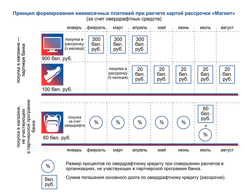 Кроме того, держателям карты рассрочки «Магнит» ежемесячно на электронную почту приходит график погашения задолженности по карте: в каком месяце и сколько денежных средств необходимо внести до полного погашения овердрафта или рассрочки по карте.