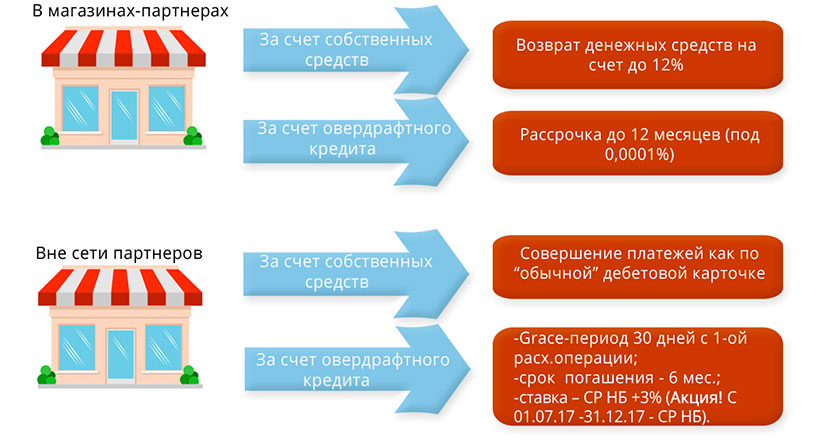 При совершении первой расходной операции в организациях торговли и сервиса, не участвующих в партнерской программе банка, на 30 дней предоставляется grace-период по овердрафту с процентной ставкой – 0,0001%.
