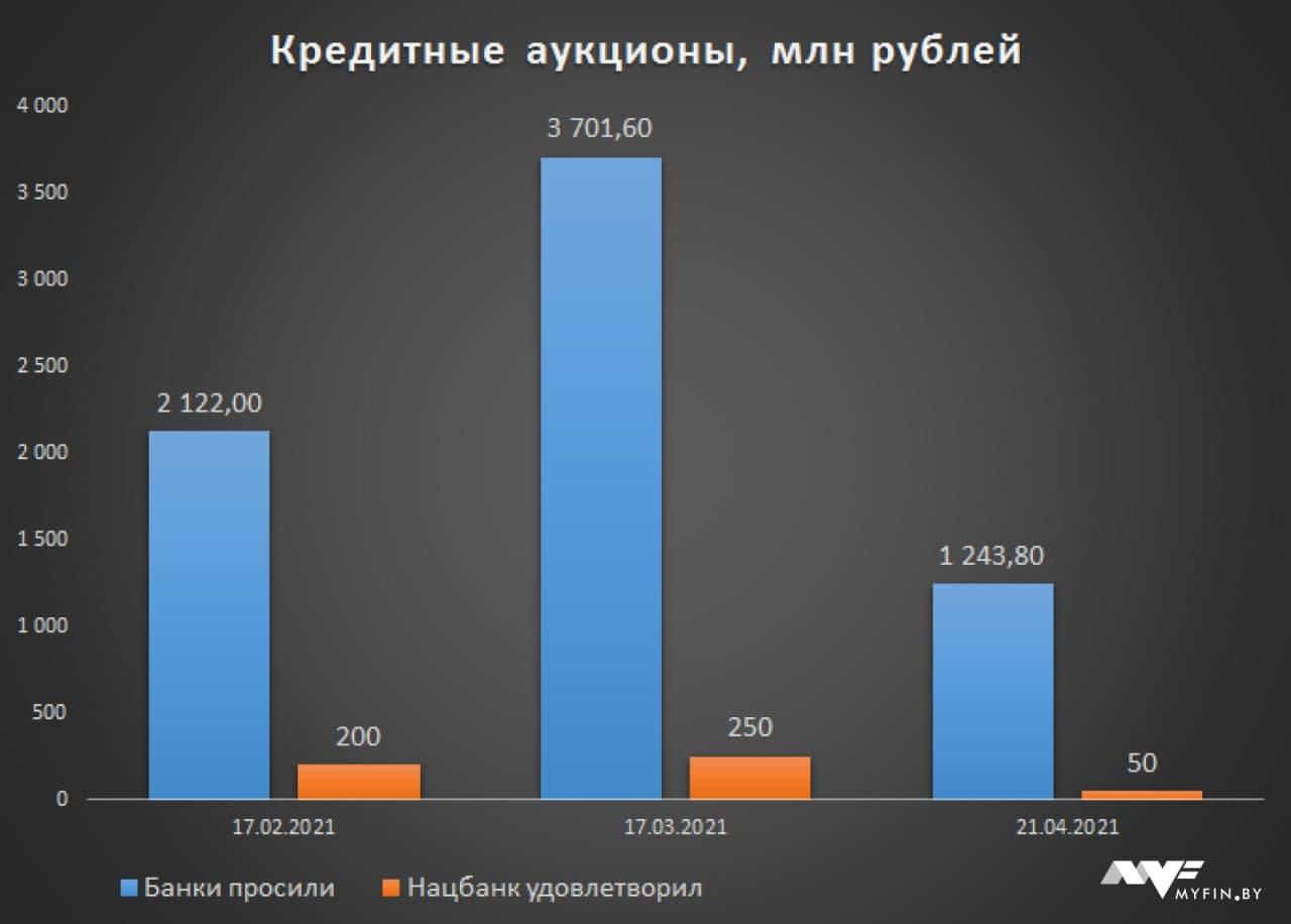 Вчера прошел очередной кредитный аукцион по поддержке ликвидности. На нем белорусские банки оставили заявки на 1,2 млрд рублей под ставку 10,5% годовых. Но Нацбанк не удовлетворил и десятой части заявок, выдав только 50 млн рублей. Как проходили кредитные аукционы в этом году, смотрим в инфографике Myfin.by.