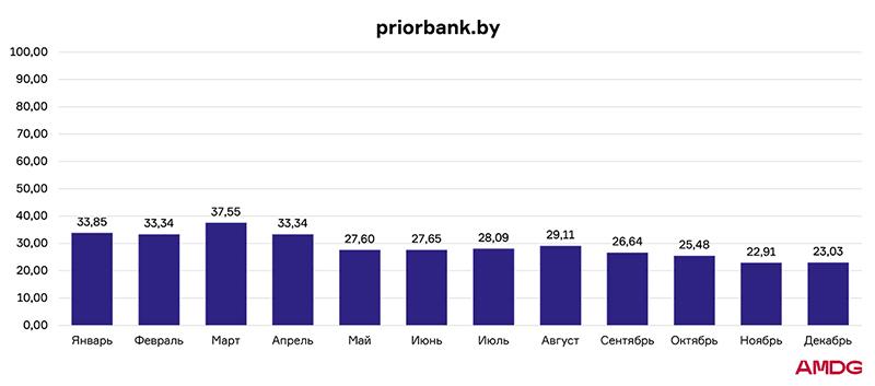 В январе 2022 года Приорбанк располагался на втором месте рейтинга. К концу года банк потерял более 10% видимости сайта. Такое снижение не могло не повлиять на позицию priorbank.by в таблице. В декабре 2022 года Приорбанк занял шестую строчку с видимостью 23,03%.