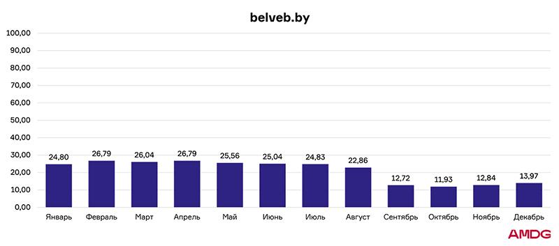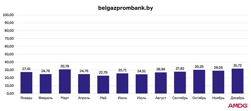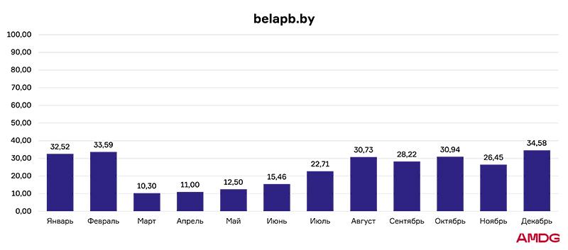 Видимость Белагропромбанка в 2022 году была нестабильной. В марте показатель достиг своего минимума — 10,30%, что исключило банк из ТОП-10 на два месяца (март–апрель). Несмотря на сильные изменения в видимости, к декабрю у банка получилось вырасти на 2,06% (относительно января) и достигнуть максимального показателя за год в 34,58%. Белагропромбанк в годовом рейтинге занимает шестую позицию.