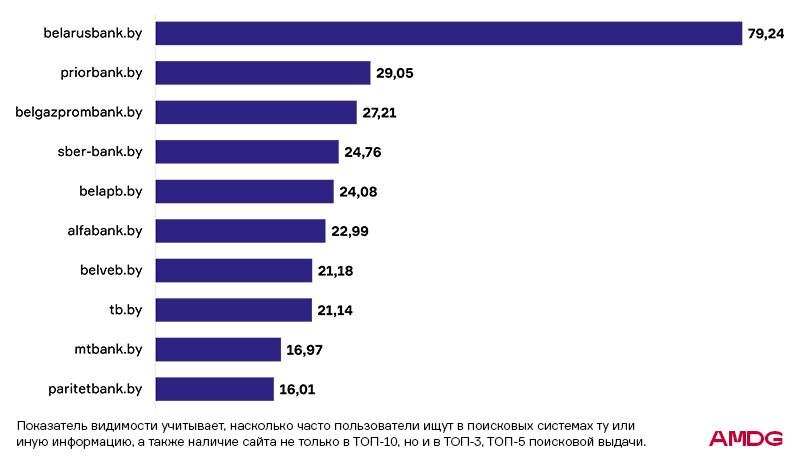 За ними следуют Альфа Банк со средней видимостью 22,99%, Банк БелВЭБ — 21,18%, Технобанк — 21,14%, МТБанк — 16,97%, а также Паритетбанк — 16,01%.