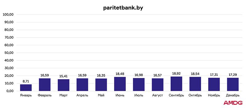 Паритетбанк в марте попал в ТОП-10 рейтинга видимости банков с показателем 15,41%. С тех пор paritetbank.by стабильно находился в десятке. Минимальная видимость была в январе — 8,71%. К декабрю 2022 года показатель вырос на 8,59% и составил 17,29%. Максимального процента видимости банк достиг в сентябре 2022 года ― 18,94%, расположившись на 8-й строчке рейтинговой таблицы.