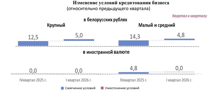 В IV квартале 2025 г. смягчились условия кредитования в одинаковой степени для всех категорий бизнеса. При кредитовании в иностранной валюте смягчение затронуло только представителей малого и среднего бизнеса.