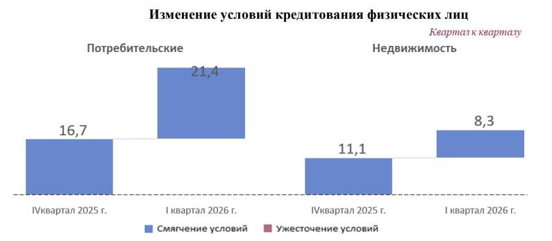 По мнению банков, условия кредитования физических лиц в отчетном квартале в целом улучшились, в большей степени по потребительским кредитам, и такая тенденция сохранится в текущем квартале.