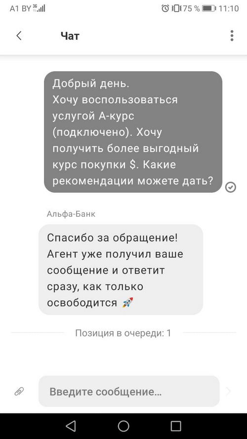 Интересно, что скажут в онлайн-чате Альфа-Банка по поводу рекомендуемого курса. Пытаюсь выяснить у Альфачей, по какому курсу валюту купить реально.