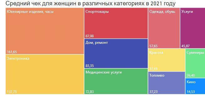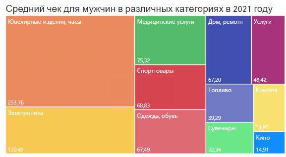 К примеру, благодаря аналитике Белгазпромбанка, можно узнать о среднем чеке мужчин и женщин в различных категориях услуг и товаров. Так, в 2021 году средний чек для мужчин в категории «ювелирные изделия, часы» составил 253 рубля, у женщин – 161 рубль, «электроника» – 130 и 137 соответственно, «медицинские услуги» – 75 и 72 соответственно, «топливо» – 39 и 37, а «кино» – почти 15 рублей и у мужчин, и у женщин (подробнее смотрите инфографику).
