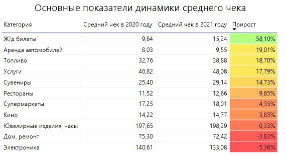 По динамике среднего чека, в 2021 году наибольший прирост был отмечен по железнодорожным билетам – 58% (средний чек в 2020 году – более 9 рублей, в 2021-м – более 15 рублей), по аренде автомобилей – 19% ( 8 и 9,55 рубля соответственно), по топливу – более 18% (32,76 и 38,78 рубля соответственно). А вот по категориям «дом, ремонт» и «электроника» средний чек в 2021-м году уменьшился почти на 4% и 5% соответственно (подробнее смотрите инфографику).
