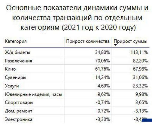 При этом прирост суммы транзакций в сравнении с 2020 годом в 2021-м составил 113% по билетам в железнодорожном транспорте, 82% в категории «развлечения», почти 68% – в категории «кино». А количество транзакций в этих категориях выросло почти на 35%, 70% и 62% соответственно.