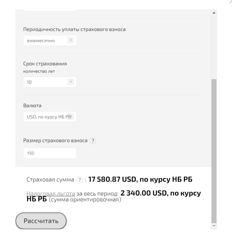 Что касается доходности, то программа накопительного страхования МТБанка, по словам оператора, может достигать 4,5% годовых в валюте. Этот инструмент максимально похож на валютный вклад. Вносишь регулярные ежемесячные платежи, в конце срока страхования (или при наступлении страхового случая) получаешь на руки крупную сумму. Есть и свои тонкости: калькулятор расчета страховой суммы на сайте банка показывает, что за 10 лет общая сумма страховки будет меньше, чем если бы я просто откладывал ту же сумму в ящик стола.