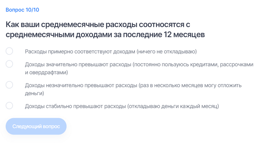 Опрос совсем несложный, состоит из вопросов о возрасте, сумме сбережений, имеющихся кредитах, оценке уровня опыта в инвестициях, целях по доходности инвестиций, сроках и планируемых суммах сбережений и пр.