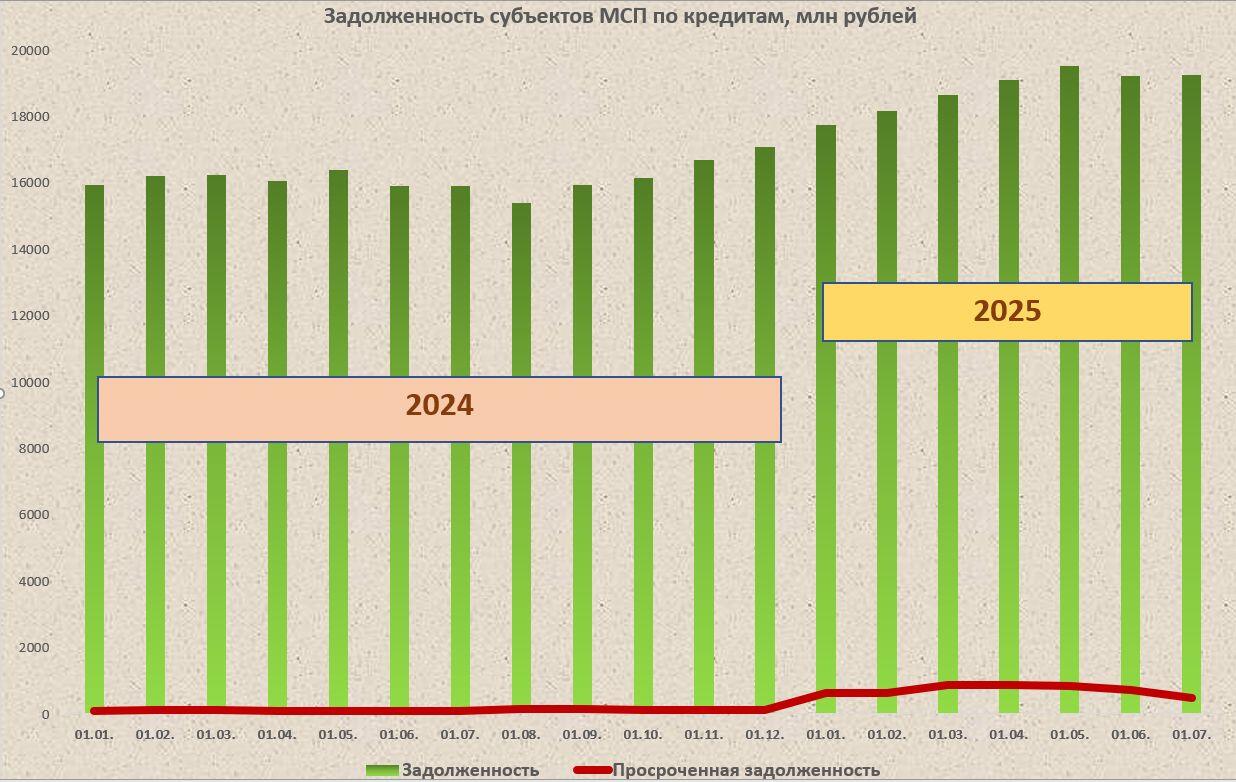 В частности, объем выданных краткосрочных кредитов увеличился на 17 %, до 29,6 млрд рублей, а долгосрочных – на 37,6 %, до 6,59 млрд. В результате доля долгосрочных заимствований увеличилась с 14,1 % до 18,2 %. В свою очередь задолженность субъектов МСП по кредитам на 1 июля текущего года достигла почти 19,3 млрд рублей, что на 20,8 % больше, чем годом ранее. В т. ч. по краткосрочным кредитам – 7,2 млрд (+4,5 %), а по долгосрочным – 12 млрд (+33,8 %).