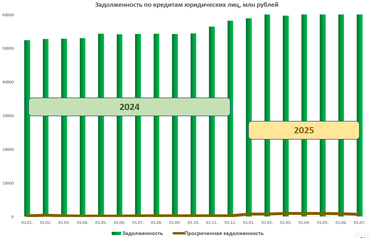 В свою очередь задолженность юрлиц по кредитам на 1 июля 2025 года достигла 61,1 млрд рублей. Это на 12,5 % больше, чем годом ранее, в т. ч. по краткосрочным кредитам – 28,5 млрд (+3,3 %), а по долгосрочным – 32,5 млрд (+12,2 %).