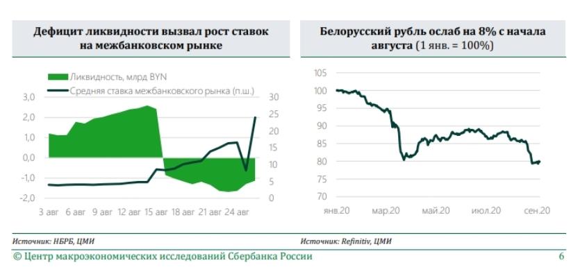 В результате, давление на белорусский рубль стремительно возросло, вызвав его ослабление на 8% с начала августа. Пытаясь стабилизировать ситуацию, Национальный банк временно приостановил постоянно доступные операции по поддержке ликвидности банков, что в условиях оттока вкладов привело к взрывному росту ставок на межбанковском рынке и перевело банковскую систему в состояние дефицита ликвидности.