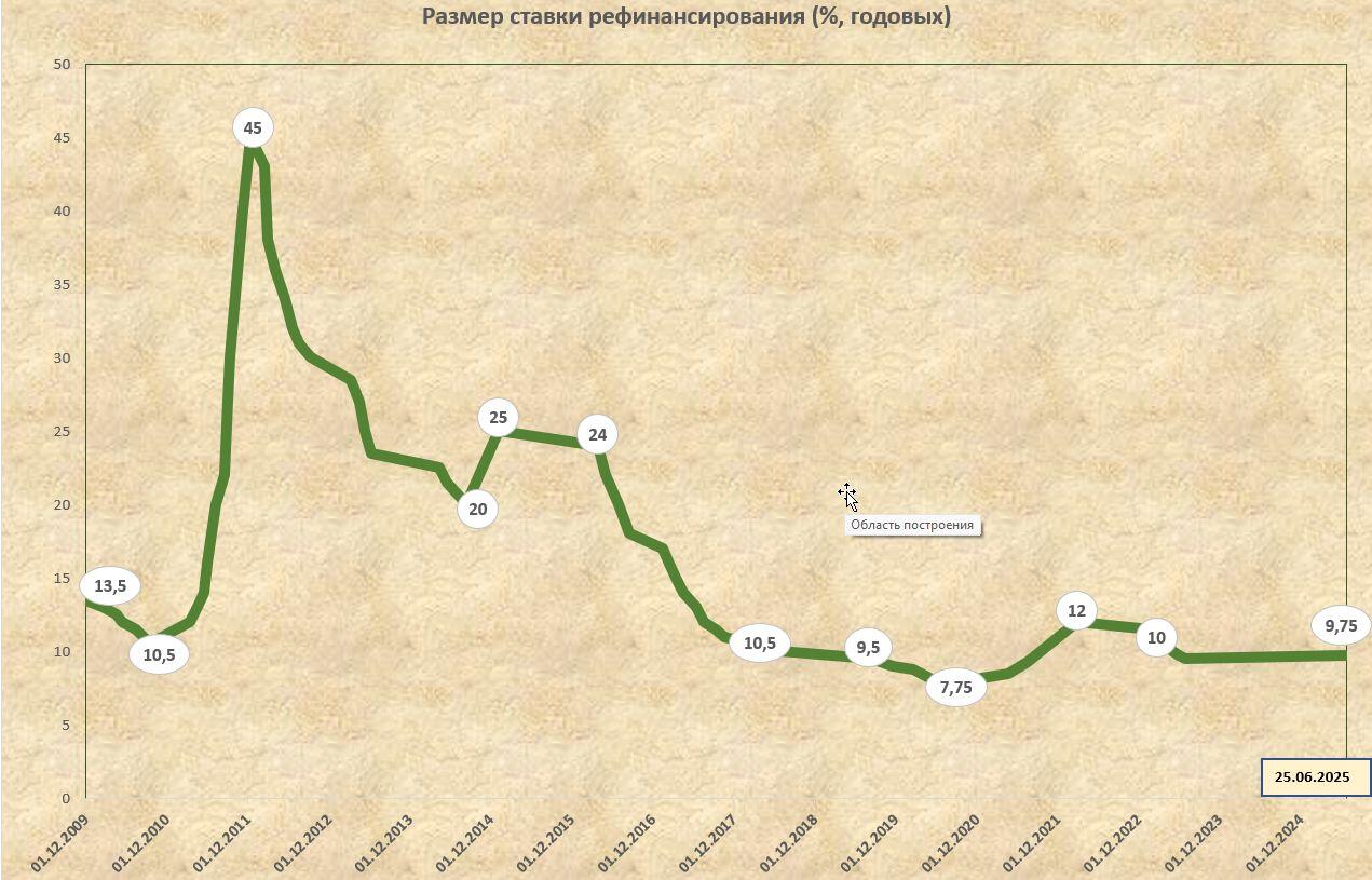 В основных направлениях денежно-кредитной политики на 2025-й год цель по ставке рефинансирования определена на уровне 9–9,3 % годовых в среднем за год.