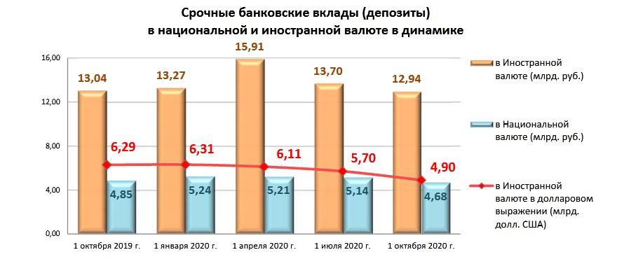 По-прежнему преобладает доля сбережений в иностранных валютах в общем объеме срочных банковских вкладов (депозитов), которая составляет 73,4%. За III квартал 2020 г. она сократилась на 0,7 процентного пункта.