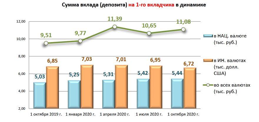 Сумма средств, приходящихся на одного вкладчика во всех видах валют в банках страны, на 1 октября 2020 года составила 11,08 тыс. рублей и увеличилась за III квартал на 0,43 тыс. рублей, или на 4,1%.