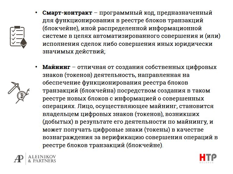 «Что мы предусмотрели в декрете? Есть приложение, которое касается терминов. Многие из этих терминов и определения этих терминов в какой-то степени уникальны не только для Беларуси, но и в принципе для мировой экономики. Какие-то вещи легализованы и уникальны в пределах страны. Например, никто еще не легализовал смарт-контракты. Первым был штат Аризона, потом Невада, насколько я помню, но на государственном уровне ни одна страна не легализовала смарт-контракты», – обращает внимание юрист.
