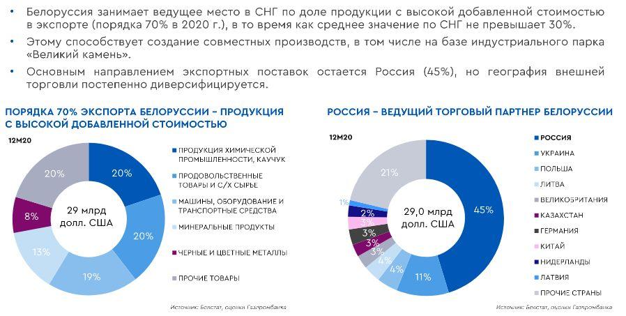 «Министерство экономики Беларуси ожидает роста экспорта на 10%, но мы ожидаем на 15% – из-за низкой базы прошлого года. Причем интересно, что несмотря на пандемию, в прошлом году Беларусь экспортировала на 11,5% больше товаров в Китай и на 20% больше продовольственной продукции в Казахстан. Получается, что при том росте мировых цен на продовольствие, которое мы сейчас наблюдаем, Беларусь может выиграть от этого», – подчеркнула эксперт.
