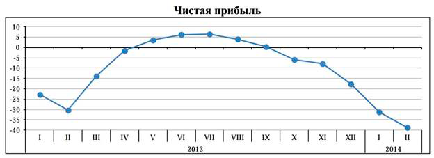 На рисунке ниже отчетливо видно, что в феврале 2014 года по сравнению с январем экономическое положение белорусских предприятий резко ухудшилось. Негативные тенденции возникли еще полгода назад, и с тех пор положительных сдвигов не было.