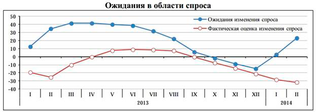 Однако на рисунке наблюдается и определенная цикличность. И в 2012, и в 2013 г. в начале года бизнес в большинстве своем оценивал экономическую конъюнктуру как неблагоприятную, однако далее ситуация поворачивалась в лучшую сторону. Можно предположить, что цикл повториться и в 2014 году и в следующие месяцы предприятия поменяют свое мнение об экономической конъюнктуре в Беларуси.