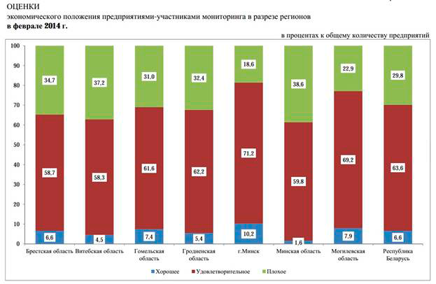 Так, в феврале 2014 года, по оценкам предприятий, экономическая конъюнктура в Беларуси продолжила ухудшаться. Неблагоприятной ее назвали более половины опрошенных – 57,6%. Для сравнения – в январе аналогичный показатель составлял 52,1%.