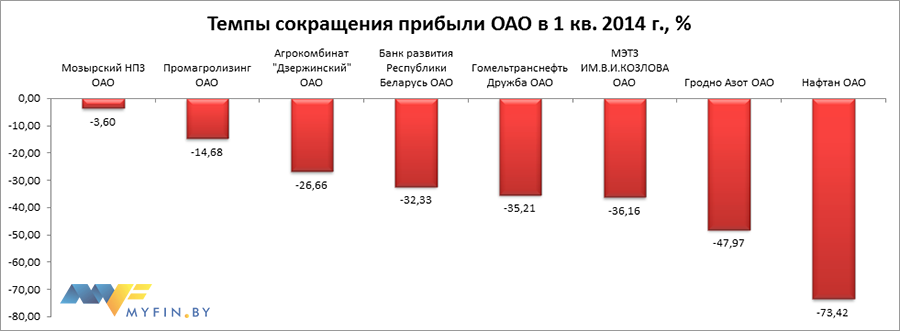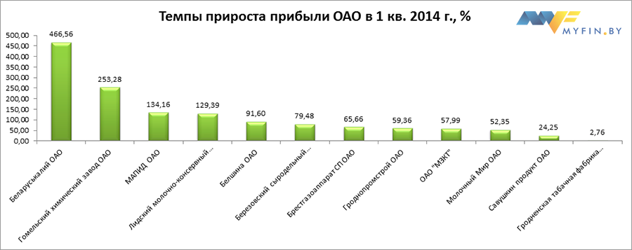Лидером по темпам прироста прибыли в 1 квартале 2014 года по сравнению с аналогичным периодом прошлого года стал Беларуськалий – плюс 466,6%. На втором месте по темпам прироста прибыли – Гомельский химический завод (+253,3%). Тройку лидеров замыкает МАПИД, прибыль которого выросла на 134,16%.