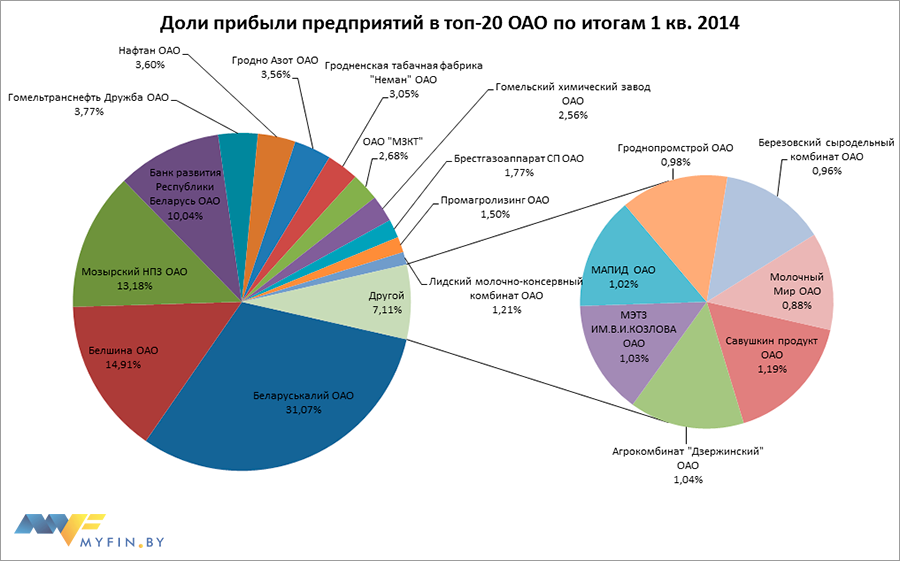 На долю самого прибыльного ОАО в 1 квартале 2014 года пришлось более 30% совокупной прибыли двадцатки крупнейших ОАО. Доля Белшины составила почти 15%, Мозырского НПЗ – 13%. Банк развития Беларуси, лидер по размеру чистой прибыли по итогам 2013 года, в рассматриваемом периоде заработал порядка 10% совокупной прибыли двадцатки крупнейших ОАО.