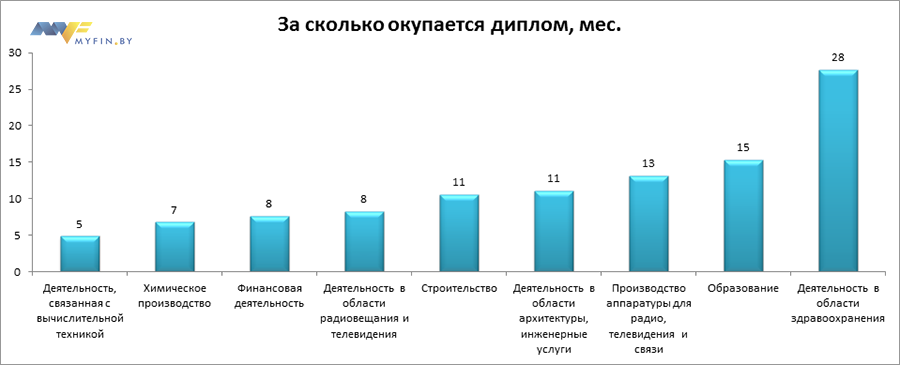 Myfin.by выяснил, за сколько месяцев окупятся дипломы специалистов. Мы выбрали ряд видов деятельности, и под каждый из них подобрали соответствующий факультет в столичных ВУЗах. Расчет, безусловно, приблизительный: с момента поступления в университет до момента получения диплома и зарплаты, и стоимость обучения могут значительно измениться. Кроме того, средняя зарплата – понятие весьма обтекаемое, и в каждом конкретном случае она может сильно отличаться.