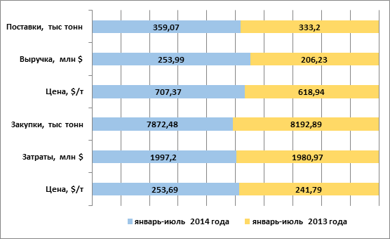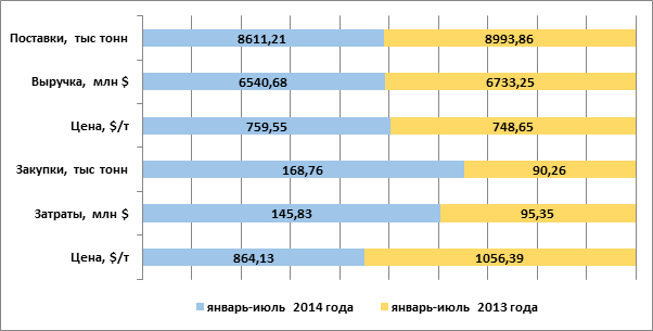 Дополнительный удар по внешнеторговому сальдо в размере $50,5 млн нанесен за счет увеличения закупок чужого нефтяного «эксклюзива». Последние выросли с 90,26 тыс тонн в январе-июле 2013 года до 168,76 тыс тонн в аналогичном периоде текущего года. Тем не менее, то благотворно сказалось на цене, которая снизилась с относительно 2013 года на 18,2%.