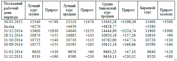 Замер температуры осуществлялся традиционно до итогов биржевых посиделок и совсем отражает биржевую подвижку до 15400. Максимально допустимая цена продажи должна быть уже повыше - 15708, но на финише месяца обычно не хватает нала, а ценники вверх рвутся не так охотно (с учетом опустевших кошельков и нехватки местных наличных). К тому же ряд банков разрешили безналичную конвертацию в рамках разрешенных лимитов, что частично снизило остроту проблемы «купить валюту».