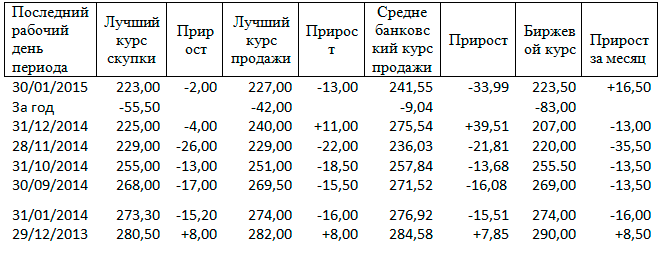 В течение месяца биржевой курс червонца у нас дрейфовал в диапазоне 207,0..235,5 BYR. При этом январь начинали при соотношении 57,49 USD/RUB, а завершили на 68,90 USD/RUB (в декабре стартовали с 49,14 USD/RUB). То есть при небольшом ежемесячном дрейфе (хотя бы на 5 USD/RUB) вполне могли бы обойтись без потрясений внутреннего валютного рынка – но это еже из области предположений (и альтернативной истории). К тому же наличный рынок жил в несколько иной реальности: