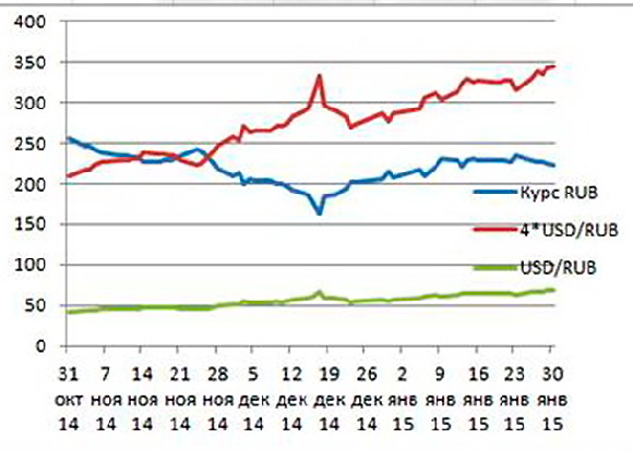 Что касается перспектив февраля, то наша стоимость червонца сильно зависит от мирового соотношения. При продолжении дрейфа в диапазоне 60..75 USD/RUB (при текущем курсе68,90 USD/RUB) вариантов немного. Снижение стоимости у нас до 200 (при походе к 75) явно нежелательно, придется бороться техническими сбоями ради экспортеров (идя на значительный рост стоимости доллара). Если нефтяные цены помогут червонцу вернуть румянец на лицо (разворот к 60..65), весьма вероятны более смелые подвижки вверх даже при скромном (на 10..20) росте стоимости доллара. При более удачной конъюнктуре возможна серия более плавных подвижек вверх, совмещением с удешевлением доллара (и активизации сдави валюты в обменники).